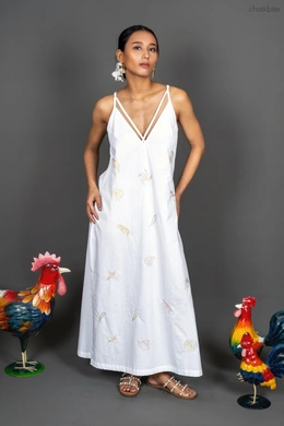 This strappy long beach dress with a deep back has hand embroidered beach motifs.