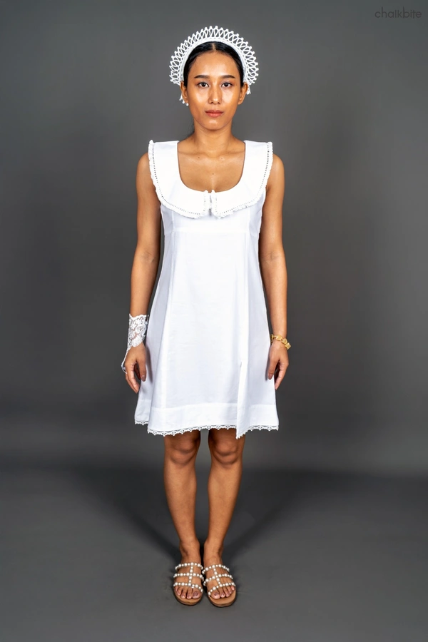 This short dress has small slit design vintage style frilly lace detail in the front.