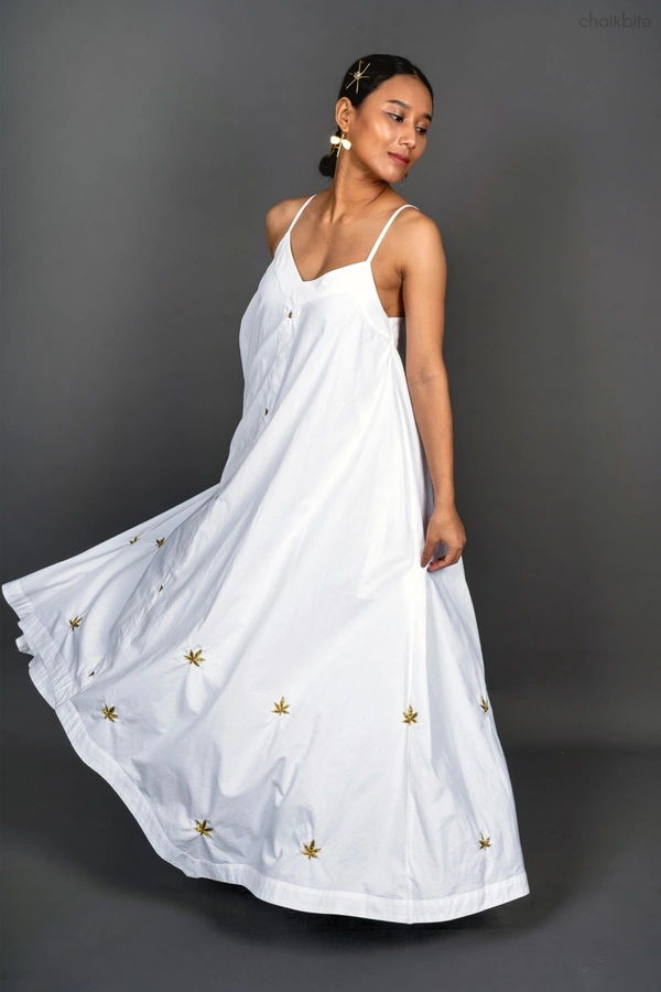 This strappy long holiday dress has hand embroidered vijaya leaf in gold zari motif.