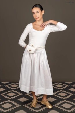This one piece dress is a perfect combination of stretch knit on top and below the waist cotton fabric gathers.
